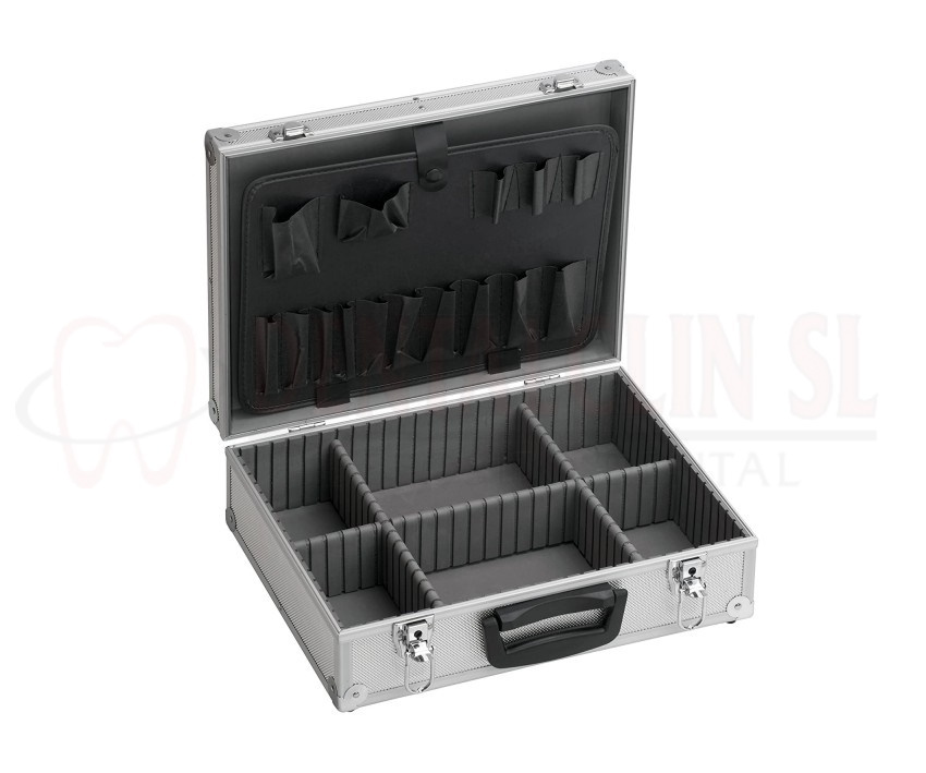 En este maletín con marco de aluminio puedes guardar el material odontologico ordenadas en tres compartimentos separados. Puedes mover los compartimentos como quieras. Además resistente pero ligero y con forro interior, mide 445x333x150 mm. Se lleva cómodamente con el asa y bandolera. Tiene dos cerraduras e incluye dos llaves.
